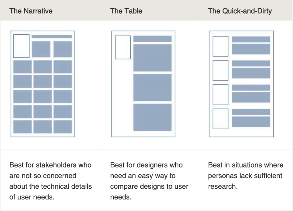 Dan Brown developed three main layouts to display personas tailored to different audiences. The first is “The Narrative,” which focuses on a grid system and is aimed at stakeholders who don’t need to want to know every detail. The following style is “The Table,” which gives more detail on the user, making it best for designers so they can quickly compare the design to user needs. The final form is “The Quick-and-Dirty,” which contains minimal information and is best when there is little research to accompany personas.