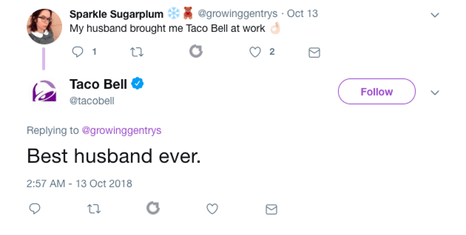 But context is more than knowing the connotations of the platform that is hosting the content. Context also means building a positive relationship between the audience and the creator through individual interactions. Many brands take this approach on Twitter by replying to customers’ tweets, usually in a comical way.
