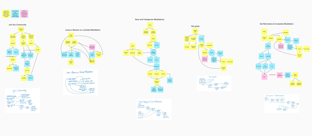 Once the information architecture was established, I began thinking about user flows. First, I set goals which described specific tasks I want the users to complete such as rating a guided meditation. I ideated ten and then chose five to sketch into user flows. Those five were: