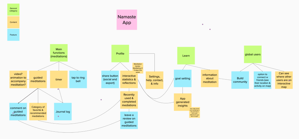 I began by breaking down Namaste into four main categories: meditation, profile, learn, and global users. All the functions the app will have can fit into one of these categories which helped me know I was on the right track. I then began filling in each category with details like specific content and features.
