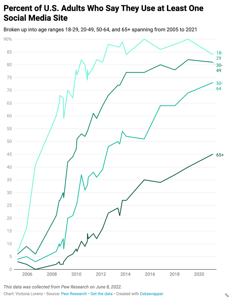 I used a line graph to express trends over time. In this example, I had data for the percent of U.S. adults who say they use at least one social media site from 2005 to 2021. Each line represents an age group and comes closer to the present, moving left to the right. This format makes it easy to see the general trend at a glance.