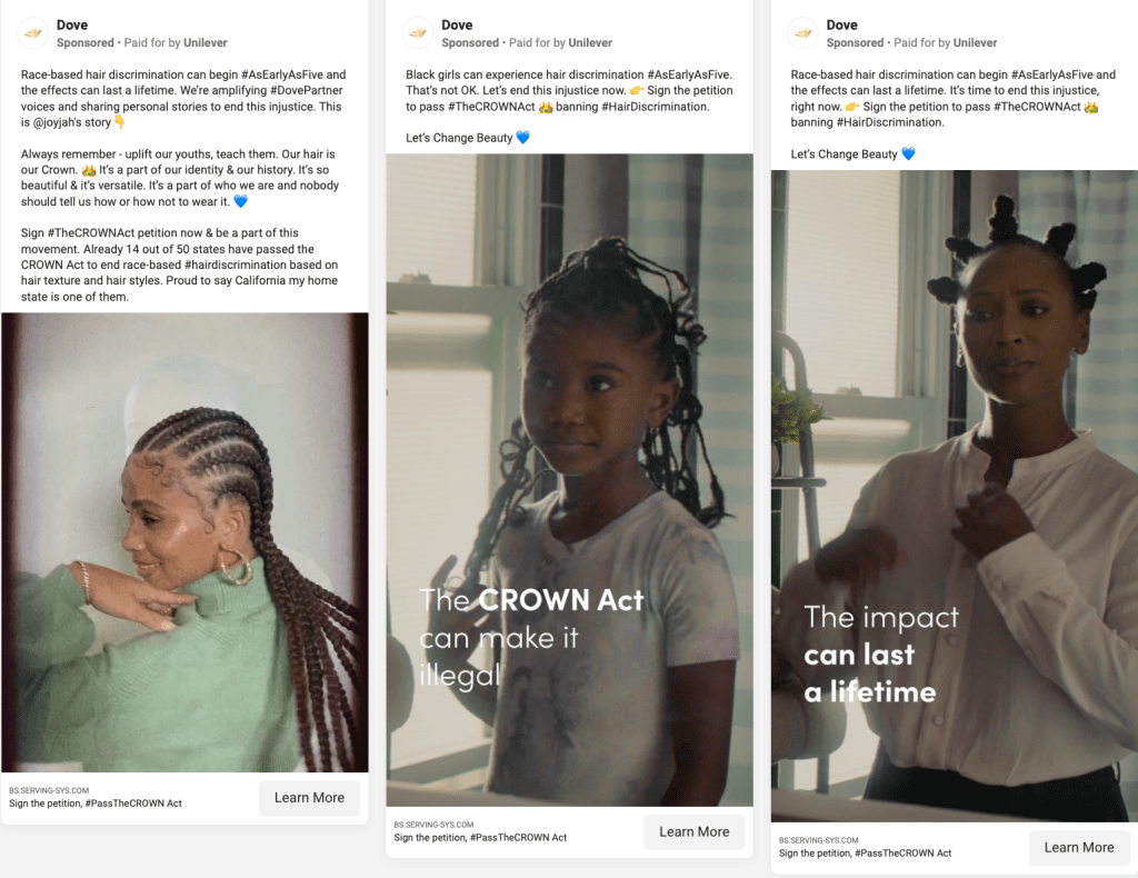 Another example of a successful campaign is Dove’s Crown Act movement urging their audience to sign a petition to help pass the crown act banning hair discrimination.