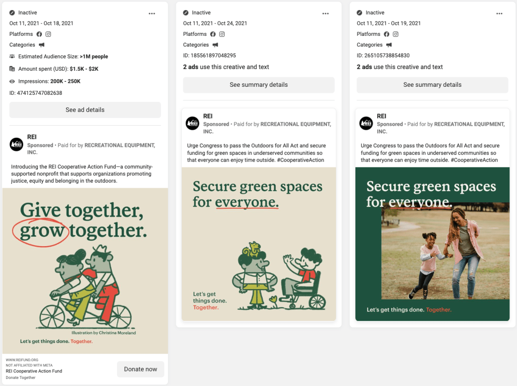 Four of the eight ads launched use copy that reads “Introducing the REI Cooperative Action Fund – a community-supported nonprofit that supports organizations promoting justice, equity, and belonging in the outdoors.” The other four say, “Urge Congress to pass the Outdoors for All Act and Secure funding for green spaces in underserved communities so that everyone can enjoy time outside. #CooperativeAction”. Both sets of copy are short and to the point but take different approaches to make their point. The first focuses on what REI is doing to make a difference while the second is a call to action for the audience to help.