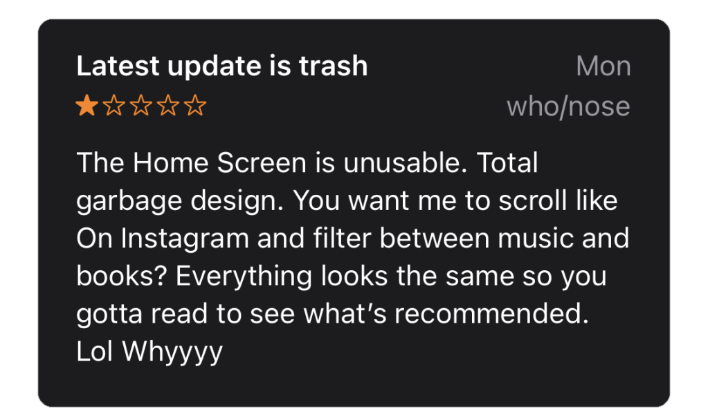 The third review focuses on the home screen. This user feels that it is unusable and frustrating. They do not like scrolling through all options because it feels too much like social media. Additionally, they have difficulty distinguishing between types of content, such as music and audiobooks.