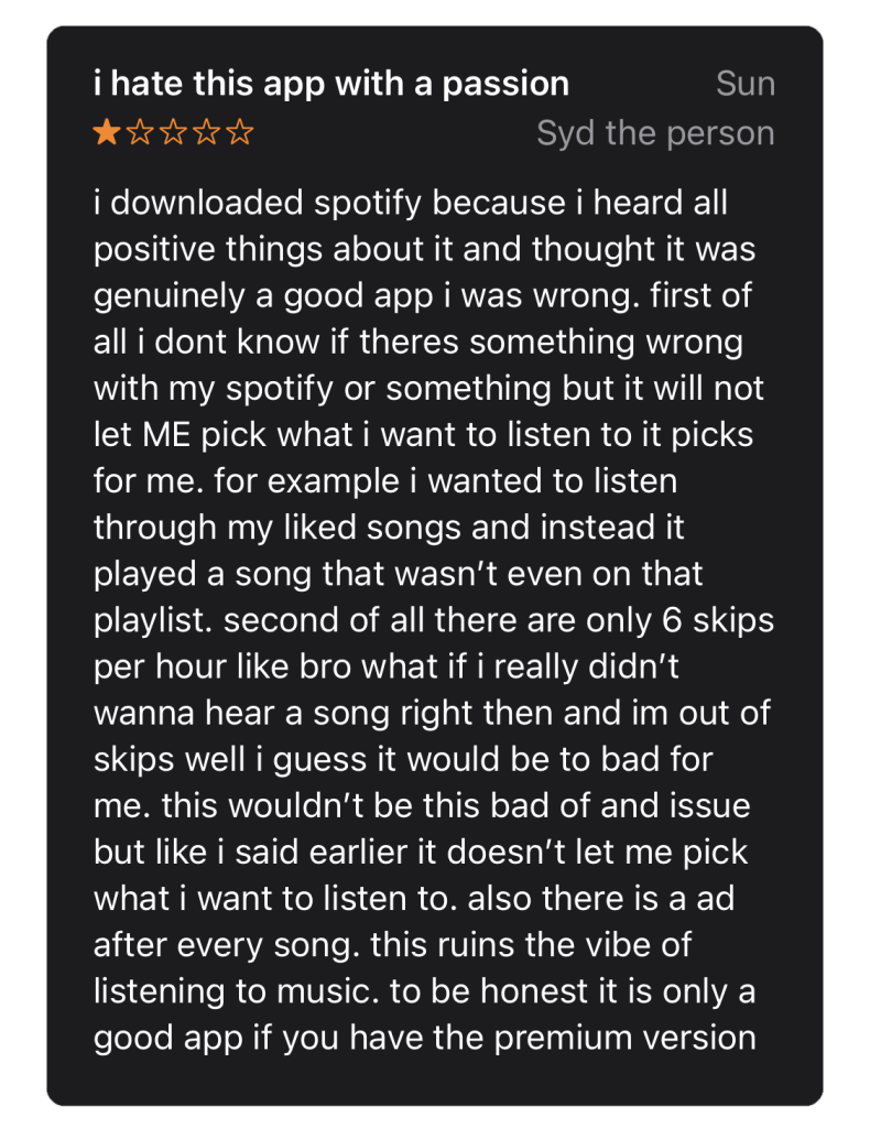 I selected Spotify as the subject for this exercise because I use the app regularly. While I mostly enjoy it, I also recognize that it has some flaws, so I wanted to get a glimpse into what other users are experiencing.