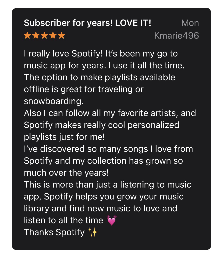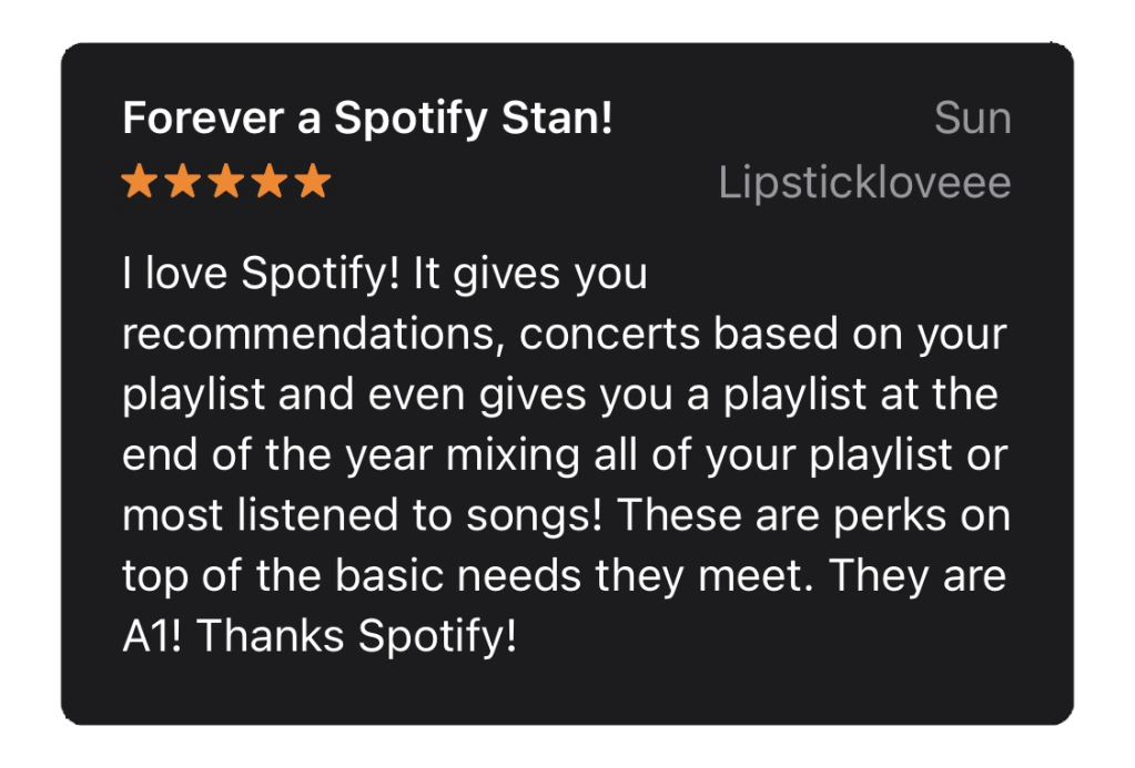 The third positive review comes from a user who enjoys the music recommendations, updates about local concerts for bands you listen to, and Spotify Wrapped. Spotify Wrapped is a yearly review of users’ listening habits, giving them insight into what they listened to the most and how they compare to other users. Features like this make this user feel like Spotify not only meets their basic needs but goes above and beyond.