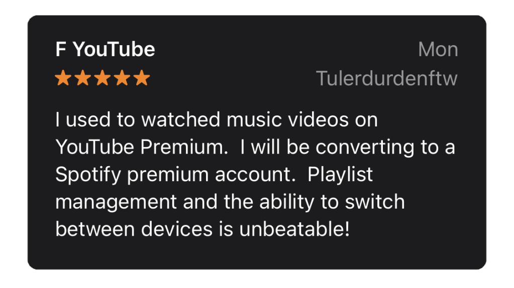 The first review is from a user who used to use YouTube Premium but switched to Spotify premium. This user likes how easy it is to transfer a listening session from one device to another. It is also worth noting that Spotify Premium is less expensive than YouTube premium.