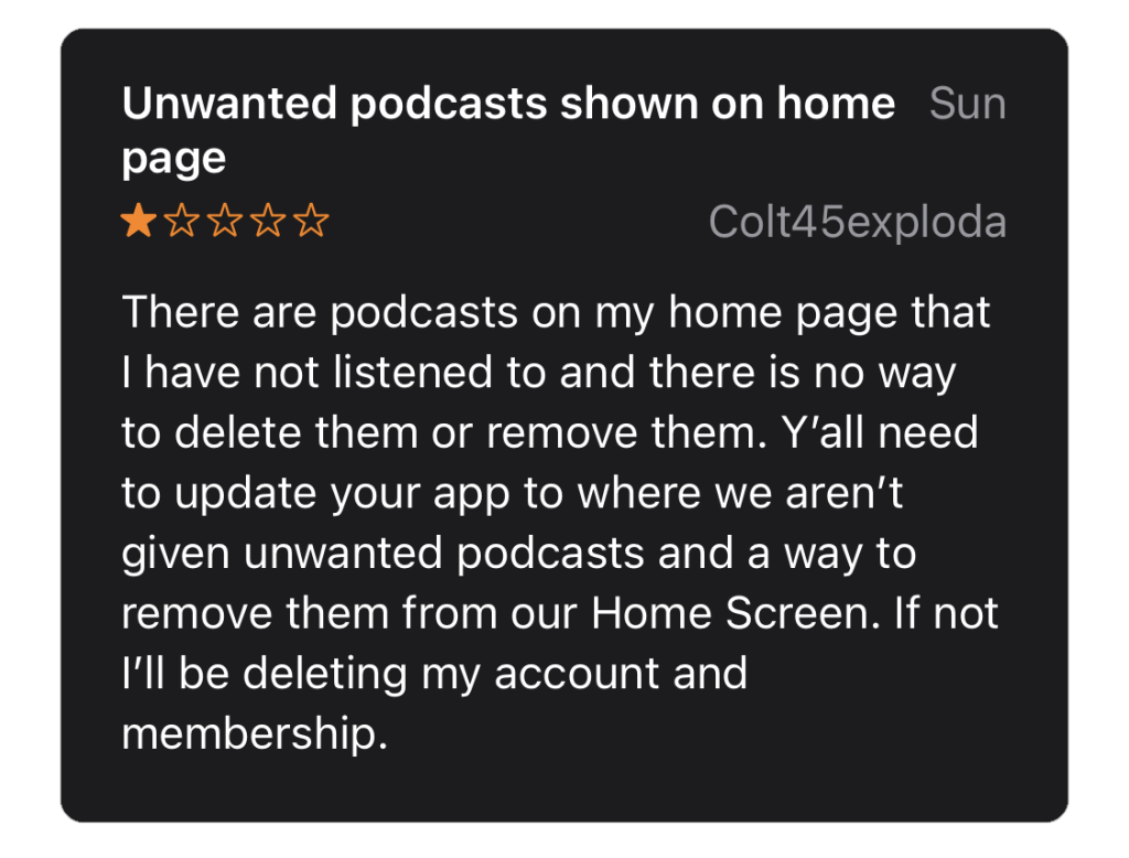 The third review focuses on the customizability of the home page. This user found content they weren’t interested in, such as podcasts, was regularly appearing on their homepage. Because the homepage is the first thing a user sees when they open the app, it is reasonable that they want only to see the content they like and want to engage with.