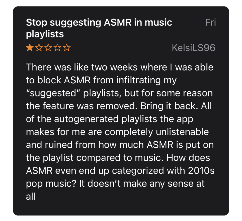 The next review is from a user who wants to remove a particular genre from their suggested playlists. This user has found ASMR is taking over their listening experience. ASMR, or autonomous sensory meridian response, is audio and video content that is known for giving listeners pleasant tingly feelings. Because ASMR isn’t music, this user wanted to filter it out of their suggested playlists but was unable to. This user was particularly frustrated because they briefly could make these adjustments before the feature vanished.
