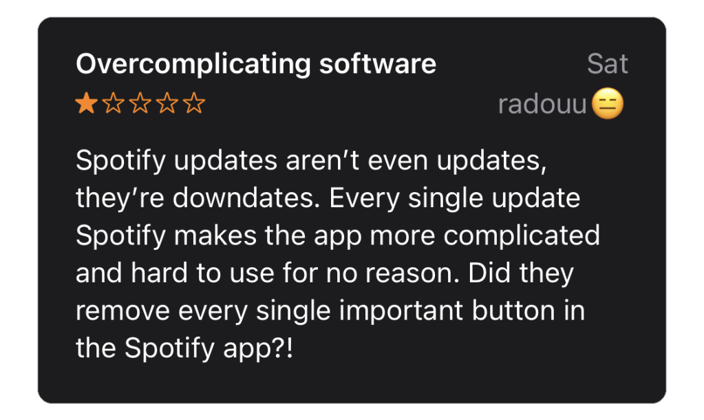 The first review is from a user who finds that Spotify updates make the app too complicated. They feel that all the important buttons are disappearing in favor of bells and whistles that take away from their experience.