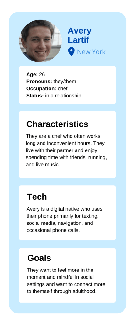 Creating a persona for your map is vital because it forces us to focus on a specific problem. Without a persona to ground us, we often begin designing for the world at large. While this may seem appealing, it negates the purpose of a journey map. A well-rounded persona includes a photo and background information, such as age, profession, or other relevant demographics.