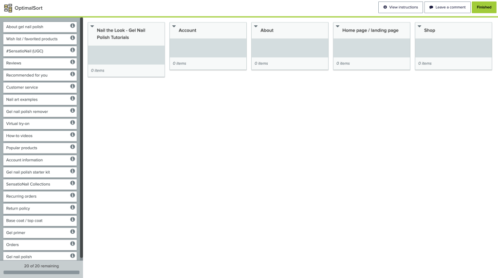 For research, I conducted a card sort activity and a usability study which provided user feedback and data to suggest changes for SensatioNail.com. Five users participated in digital asynchronous card sorting. The results outlined users’ mental models and created a clearer understanding of how users understand information related to SensatioNail, ranging from gel nail polish to how-to videos.