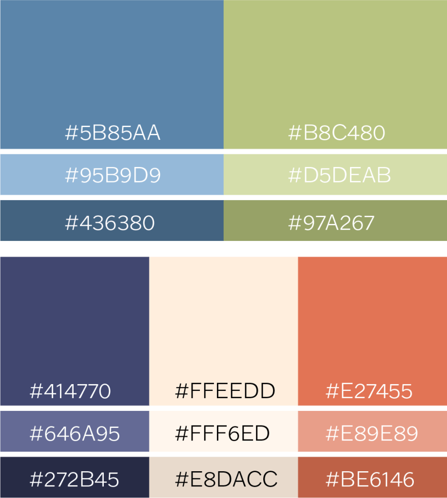 I chose two primary colors and three secondary colors for the app. The primary colors will be used throughout the branding including headlines and buttons. I decided to use blue and green for the primary colors because they are calming and earthy. For the secondary colors I used dark blue, tan, and orange. Together, these colors provide a mix of warm and cool and contrast with each other nicely.