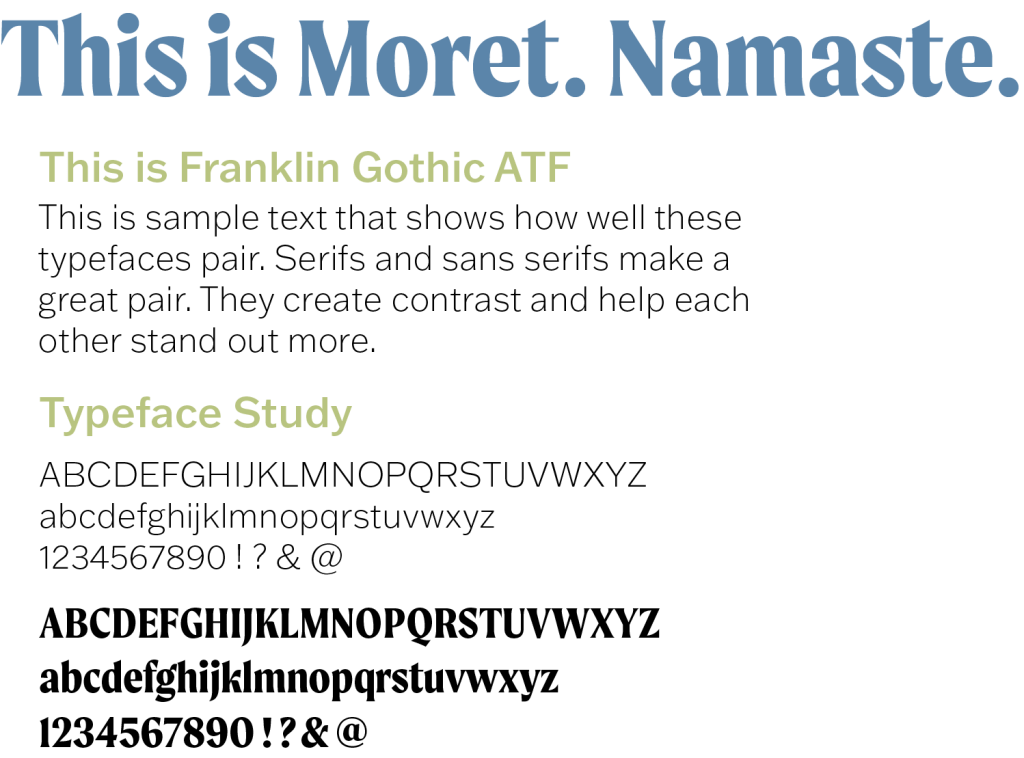 I decided to use Moret as the headline typeface. It has unique qualities like a two-story “a” and “g” and very subtle serifs. These features make it feel refined yet modern which aligns with the goal of the app. I chose Franklin Gothic ATF as the body typeface because the smooth sans serif letters contrast nicely with Moret and are easy to read. Franklin Gothic also comes in a wide variety of weights which will be helpful for creating subheadings.