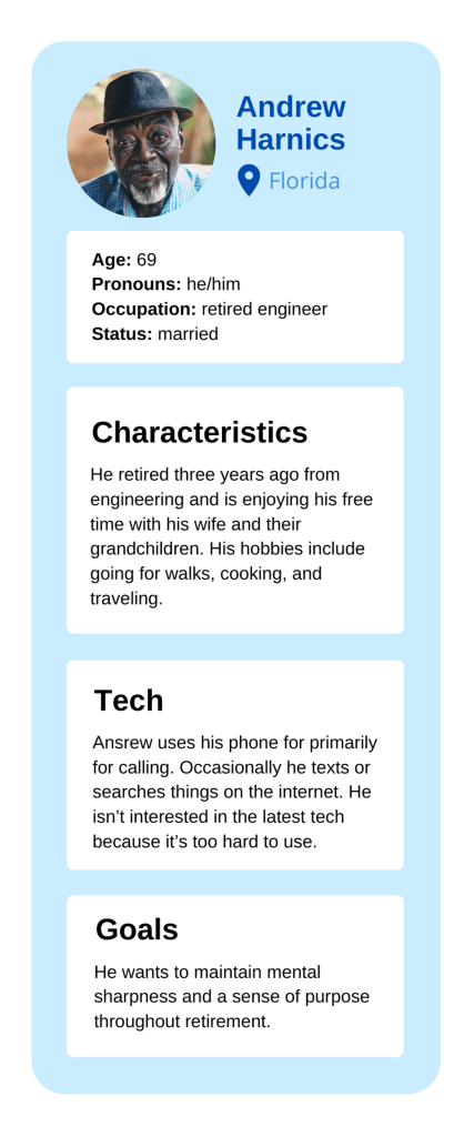 Andrew wakes up around 9:00 AM but who’s keeping track- he’s retired. He can smell his wife cooking in the kitchen down the hall. Every morning they have breakfast together and watch the news. The spend most days in the community center with their friends where they can play cards, watch TV, and hangout. Andrew was reluctant at first about the 55+ neighborhood with what he calls “old people day care” because he saw it as a sign of losing his independence and giving into old age. Here he has found friends who are just as energetic as he is. Because he still drives, he and his wife often pick up their grandchildren from elementary school in the afternoon. They work on homework together and have snacks until their parents pick them up on their way home from work. Andrew cooks dinner for himself and his wife. They take an after-dinner walk every evening and then watch a movie before going to bed.