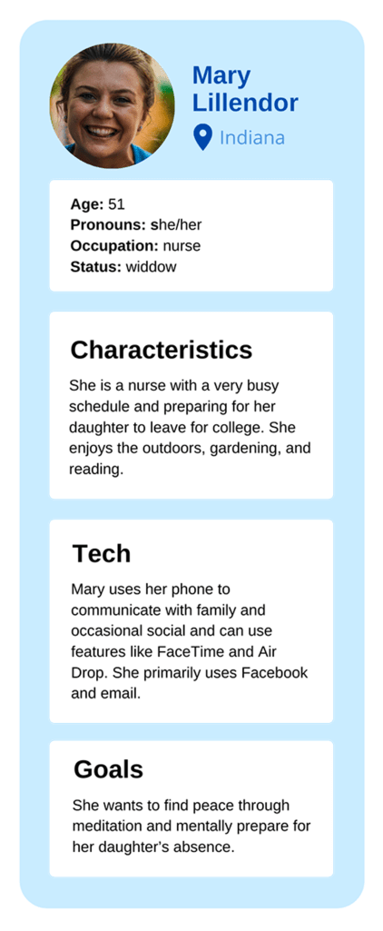 Mary wakes up at 5:00 AM and goes to the gym for an early morning class. She’s home by 6:30 with just enough time to make her daughter breakfast like she has every weekday morning for the last 18 years. After she sends her daughter off to school, she changes into her scrubs and heads to the hospital. On the drive there, she thinks about what it will be like when her daughter leaves for college. Her husband passed away two years ago and she’s nervous to be alone. She comes home from her shift at the hospital at 5:00 PM and starts preparing dinner. She eats with her daughter and they cleanup together. Mary gets ready for bed and finds herself spending that time worrying again about the changes to come.